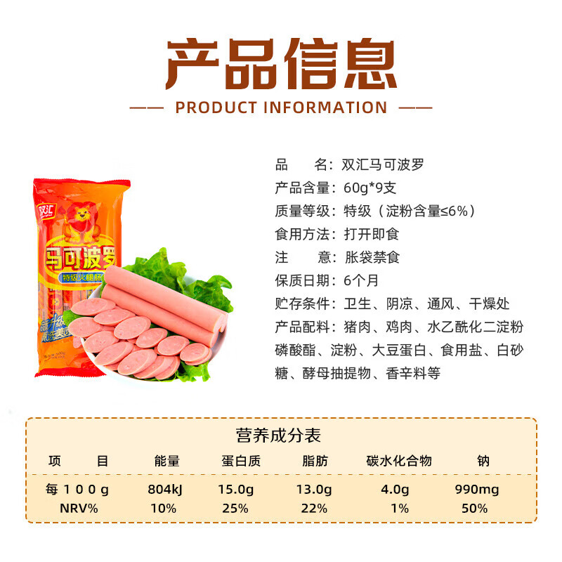 商品名称:双汇 马可波罗特级火腿肠香肠 100g*8支 休闲零食 露营 出游烧烤 速食