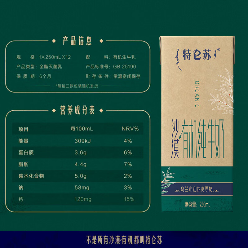 商品名称:蒙牛特仑苏沙漠有机纯牛奶250ml*12盒 精美