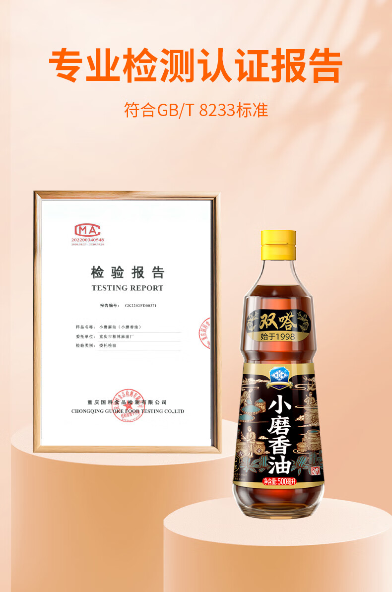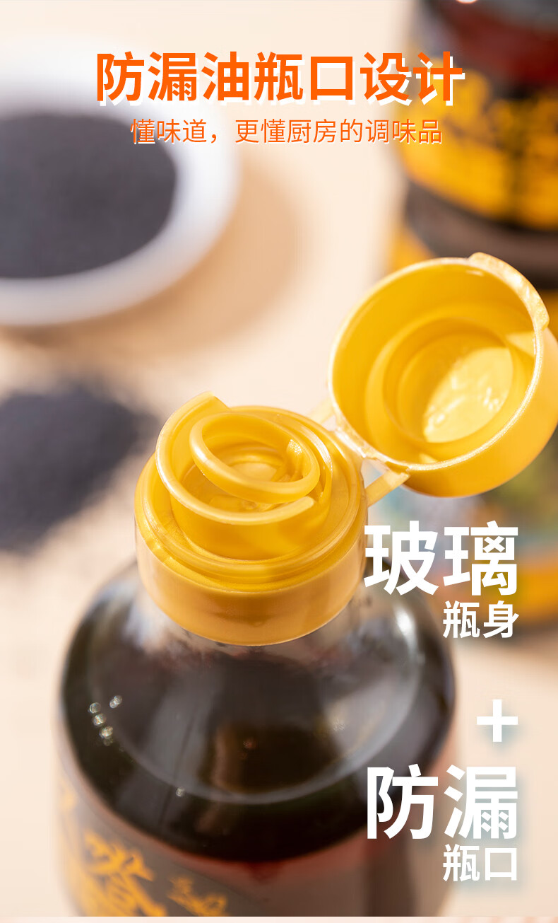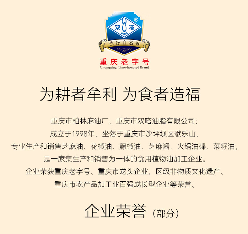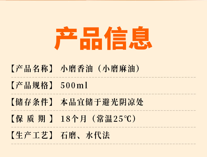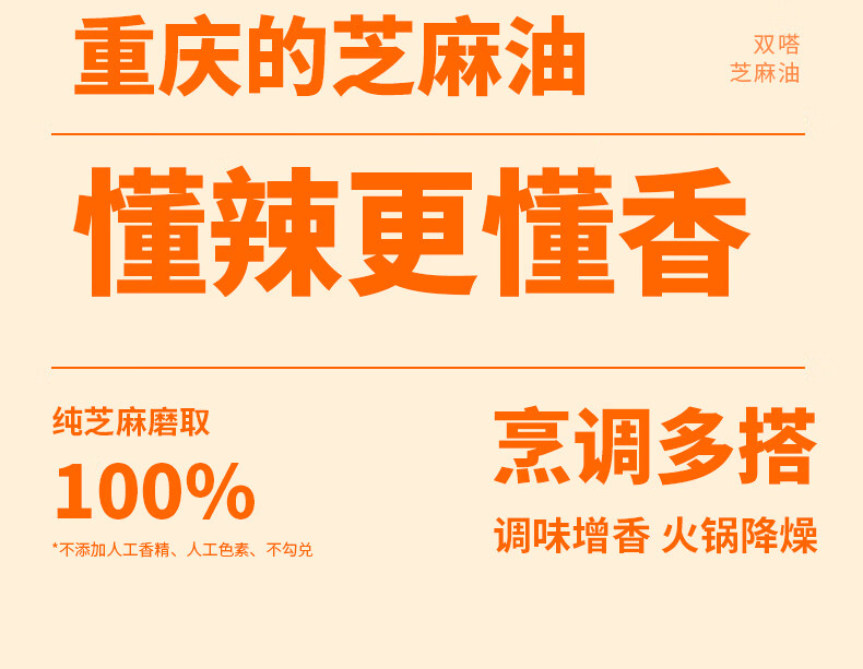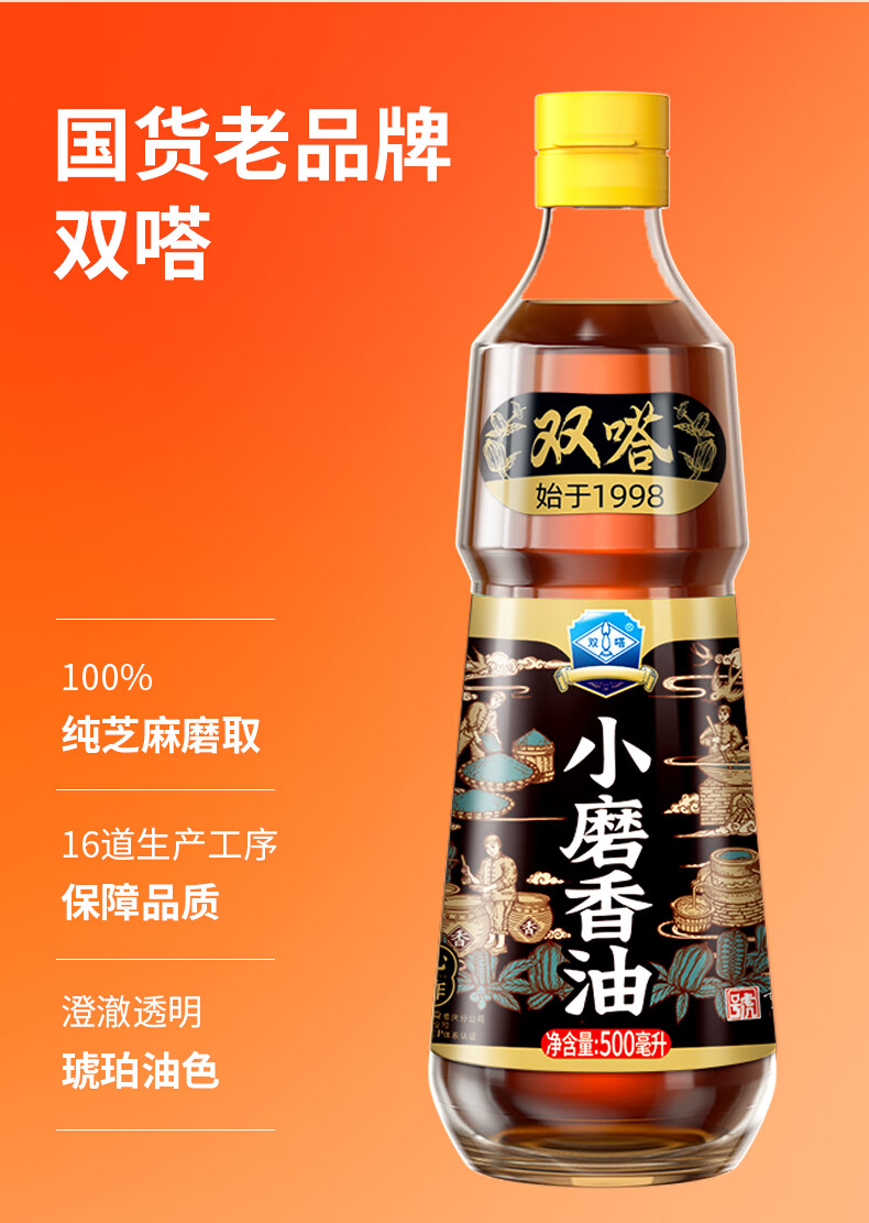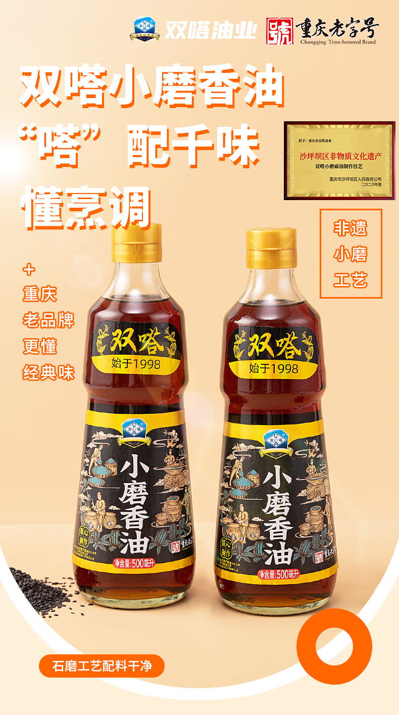 商品名称:双嗒小磨香油纯芝麻油 芝麻香油 重庆老字号 500ml 玻璃瓶装