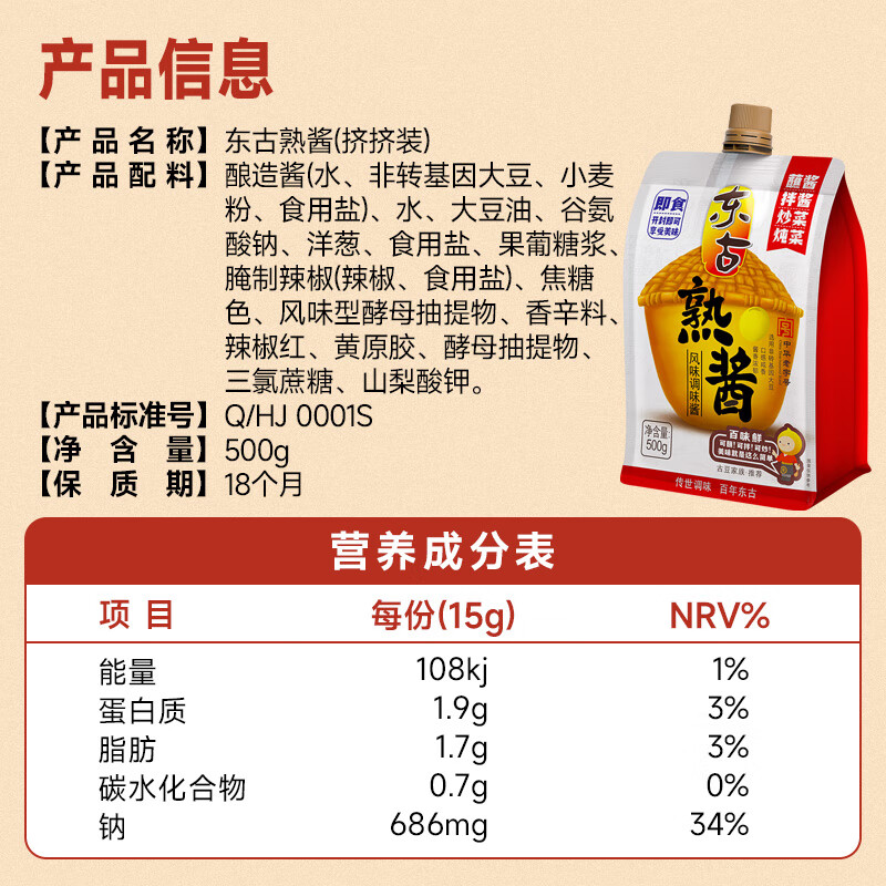 商品名称:东古 熟酱500g挤挤装 豆瓣酱东北大豆酱拌饭酱拌面酱卷饼酱调味酱