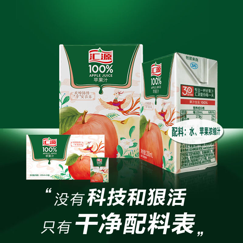 汇源100%苹果汁整箱果汁健康饮料200ml*24盒节日送礼宴请