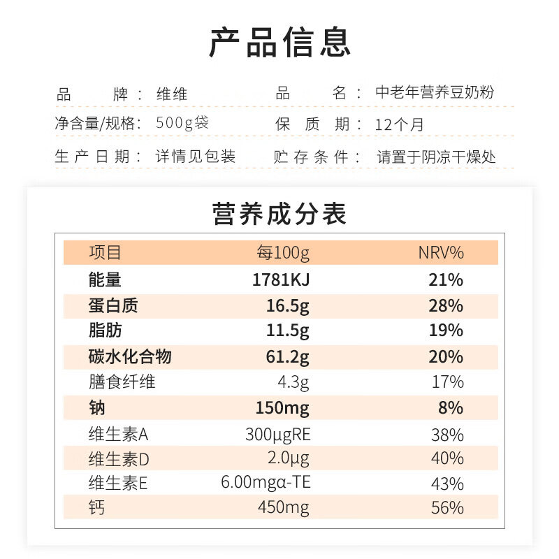 商品名称:维维中老年营养豆奶粉500g即食早餐冲饮代餐高钙多重营养非转基因大豆