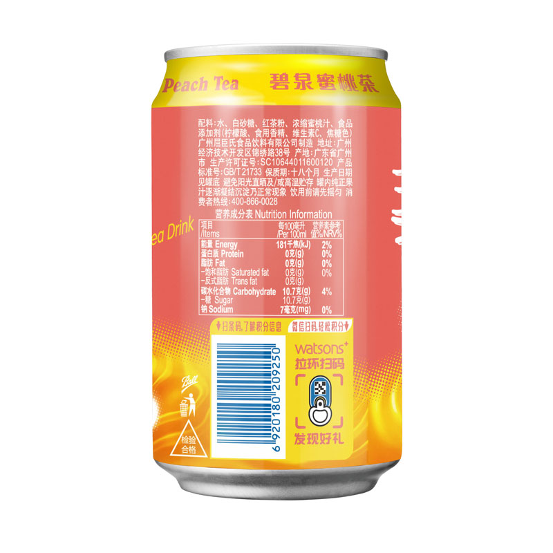 商品名称:屈臣氏(Watsons)碧泉蜜桃茶0脂饮料地道港式茶饮茶味浓郁330mL*24罐整箱