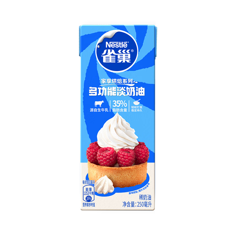 商品名称:雀巢(Nestle)烘焙原料淡奶油常温存储蛋糕裱花动物奶油 250ml