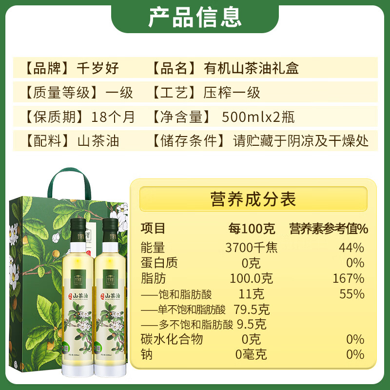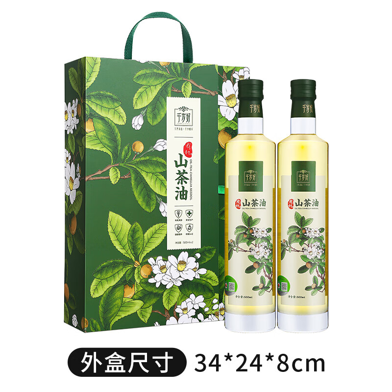 商品名称:千岁好【保真山茶油】有机山茶油礼盒500ml*2瓶 压榨一级 送礼礼盒