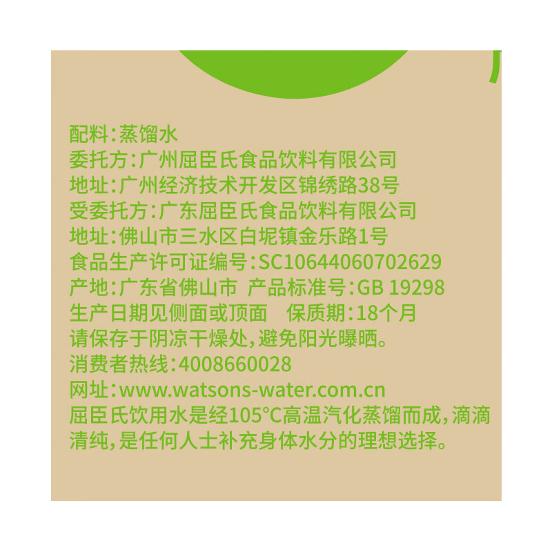 商品名称:屈臣氏蒸馏水纯净水6L*4桶整箱大桶装水饮用水家庭装泡茶煲汤