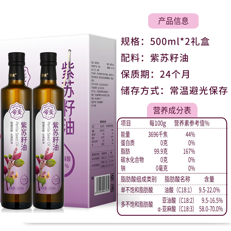 商品名称:帝麦紫苏籽油 苏子油500ml*2礼盒 春节送礼 冷榨可直饮炒菜健康食用油