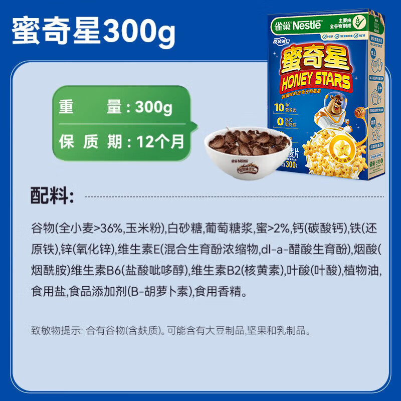雀巢(Nestle)进口儿童零食蜜奇星300g蜂蜜星星儿童麦片早餐即食非油炸全谷物