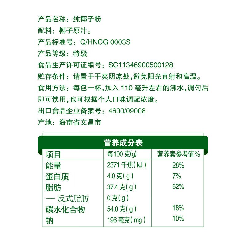 商品名称:春光食品 海南特产 纯椰子粉308g 无添加 早餐椰奶椰汁粉 独立小包装