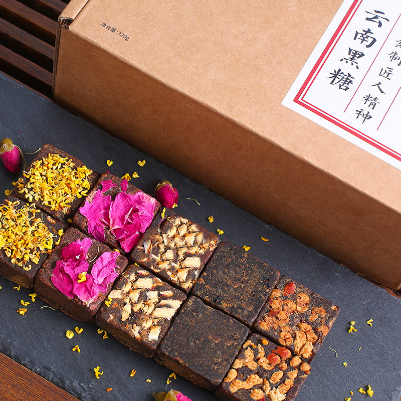 商品名称:云山半云南黑糖320g盒装手工老黑糖玫瑰红糖桂花红枣生姜原味五味黑糖块