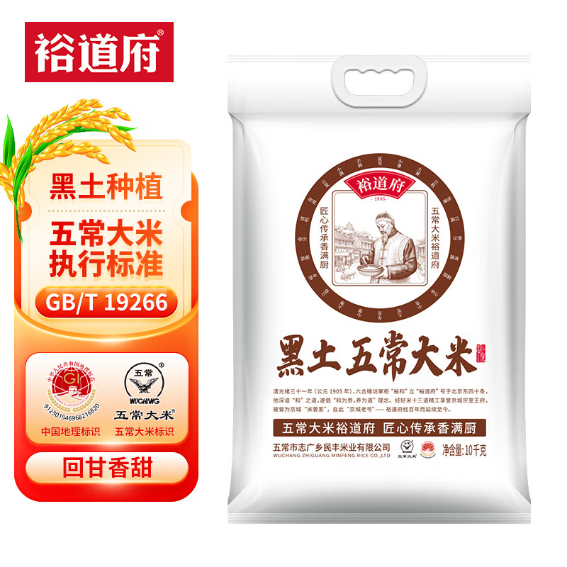 商品名称:裕道府当季新米 黑土五常大米 20斤装 东北大米 10kg 粳米