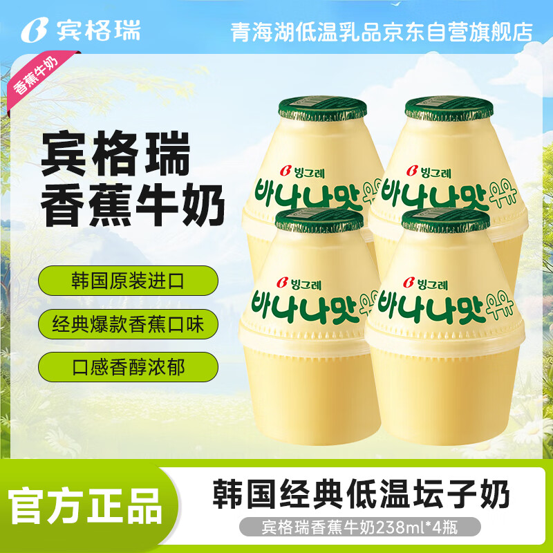 宾格瑞(BINGGRAE)香蕉牛奶238ml*4瓶 韩国进口坛子奶 早餐奶 儿童奶 学生奶 低温奶