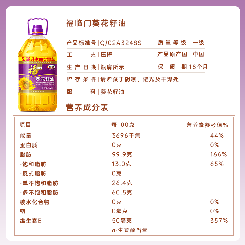 商品名称:福临门压榨一级葵花籽油5.68L 零反式脂肪酸 物理压榨无负担 中粮出品