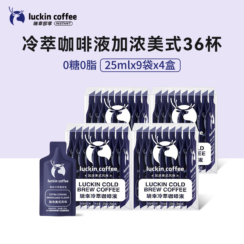 商品名称:瑞幸咖啡即享加浓冰美式冷萃咖啡液0糖0脂速溶深烘黑咖啡25ml装4盒共36杯