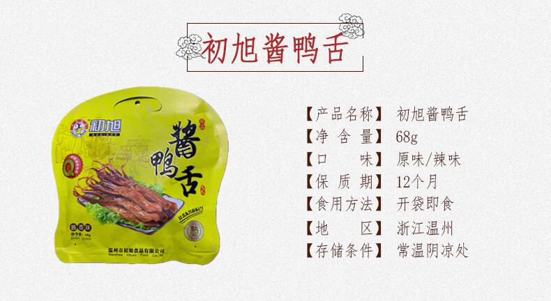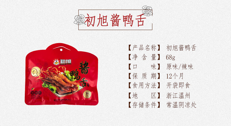 商品名称:初旭食品(chuxufood) 温州酱鸭舌68g卤香味 温州特产卤味鸭舌头肉干肉脯休闲小吃