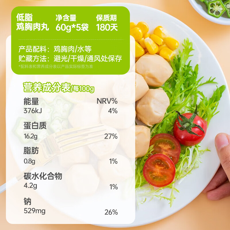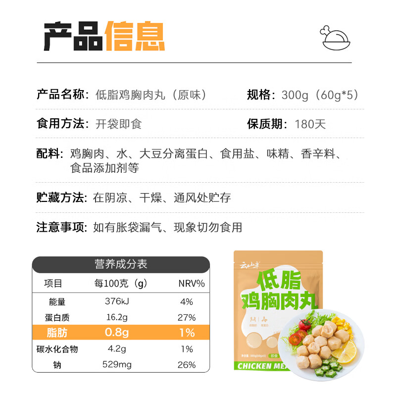 商品名称:云山半即食鸡胸肉丸原味60g*5袋 独立包装 低脂肪高蛋白健身代餐零食