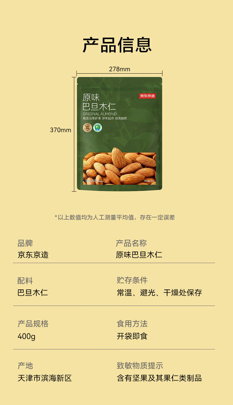 商品名称:京东京造鲜来多原味巴旦木仁400g每日坚果干果扁桃仁杏仁零食炒货京东自营