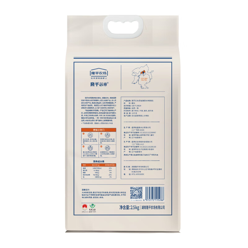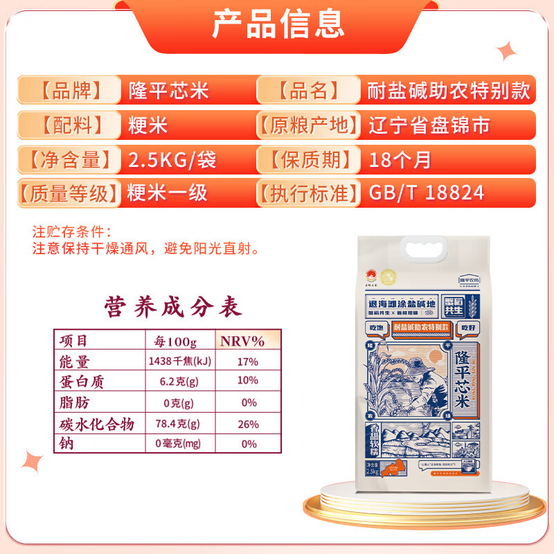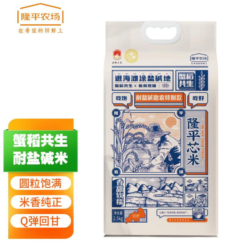 商品名称:隆平芯米袁隆平大米 耐盐碱助农特别款2.5kg 东北大米圆粒粳米5斤