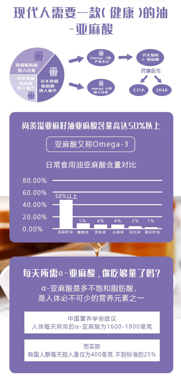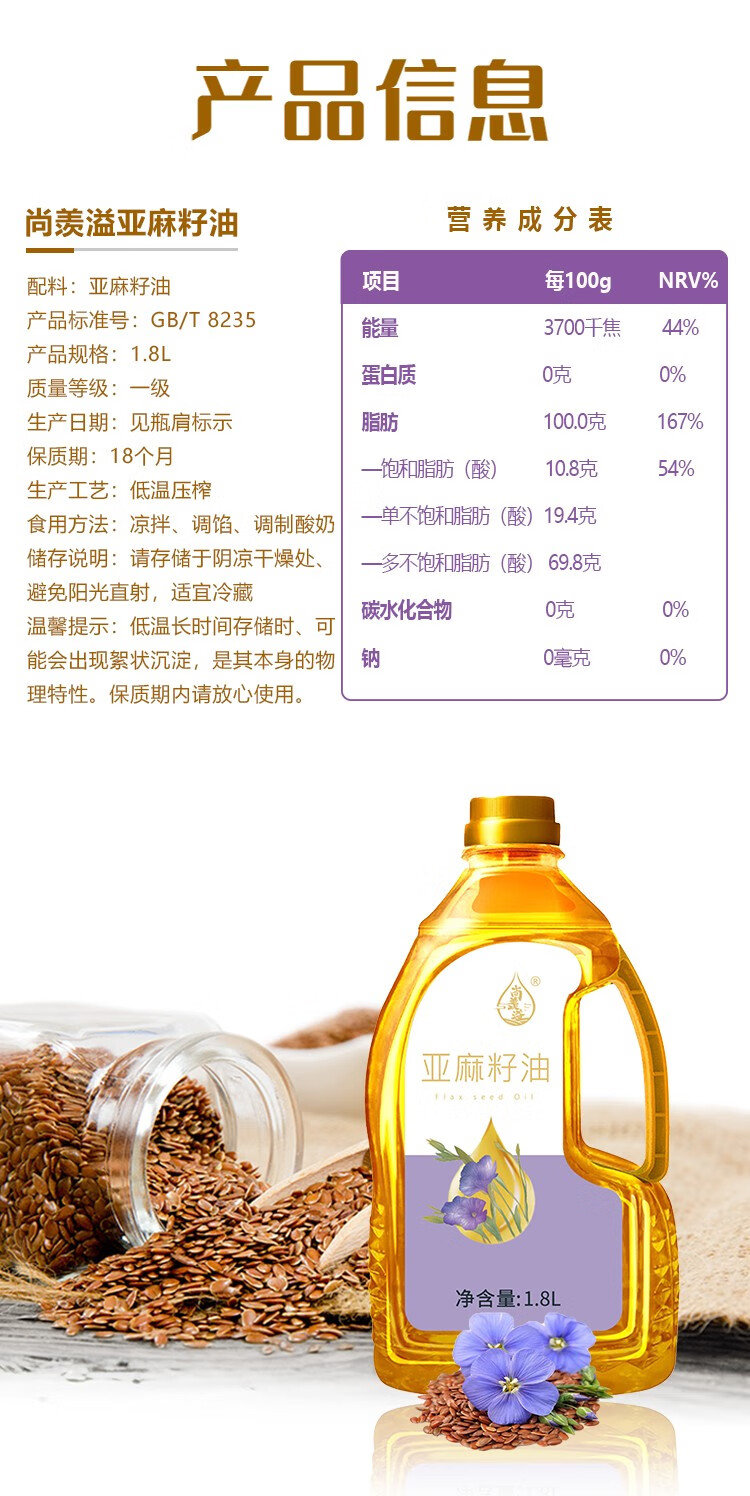 商品名称:尚羡溢亚麻籽油家庭装1800ml【进口原料,一级压榨】